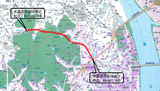 長望路西延線位于湘江新區(qū)范圍內(nèi),路線呈東西走向。道路西接黃金大道,往東沿谷山森林公園北側(cè)山體埡口,穿過龍湖湘風(fēng)原著,往東接現(xiàn)狀金星北路,再向東南連接現(xiàn)狀西二環(huán),道路全長4.611KM,并對長望路(西二環(huán)-觀沙路)段進(jìn)行了改擴(kuò)建設(shè)計,長度0.611KM,金星路、黃金大道立交范圍內(nèi)的主線及輔道進(jìn)行改造。本標(biāo)段范圍為K0+000-K1+520。其中包括跨線一座、下穿式矩形框架橋一座、地下人行通道一座,線路設(shè)計為城市主干路、設(shè)計車速60km/h。